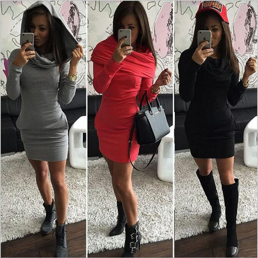 Who said you can't be hot on a winter dress? Features a full frontal neck and body covering with additional hood for a warm effect, above the knee length to showcase your favorite boots, knit type fabric to match the winter season, and body hugging shape for that irresistible hot chic in the middle of winter touch!